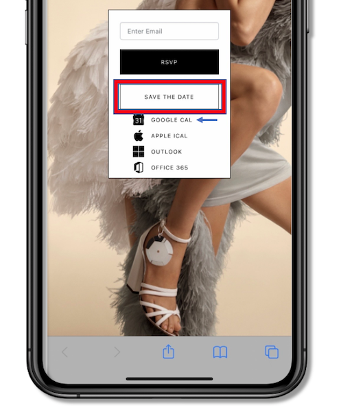 VISX RSVP supports different calendars so you will never have to worry about “forgetting the date” again. Shoppers can “Save The Date” via the box highlighted above, by adding the live stream event to their Google Cal, iCal, Outlook or Office 365.